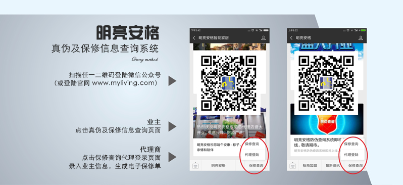 明亮安格公司緊跟時(shí)代發(fā)展,建立電子保修服務(wù)系統(tǒng),全國(guó)連網(wǎng)數(shù)據(jù)庫(kù)支持,正品保證,手機(jī)上即時(shí)錄入與查詢,讓安裝信息一目了然,可以為客戶提供更優(yōu)質(zhì)服務(wù)的同時(shí),使客戶更有歸屬感,信任感。